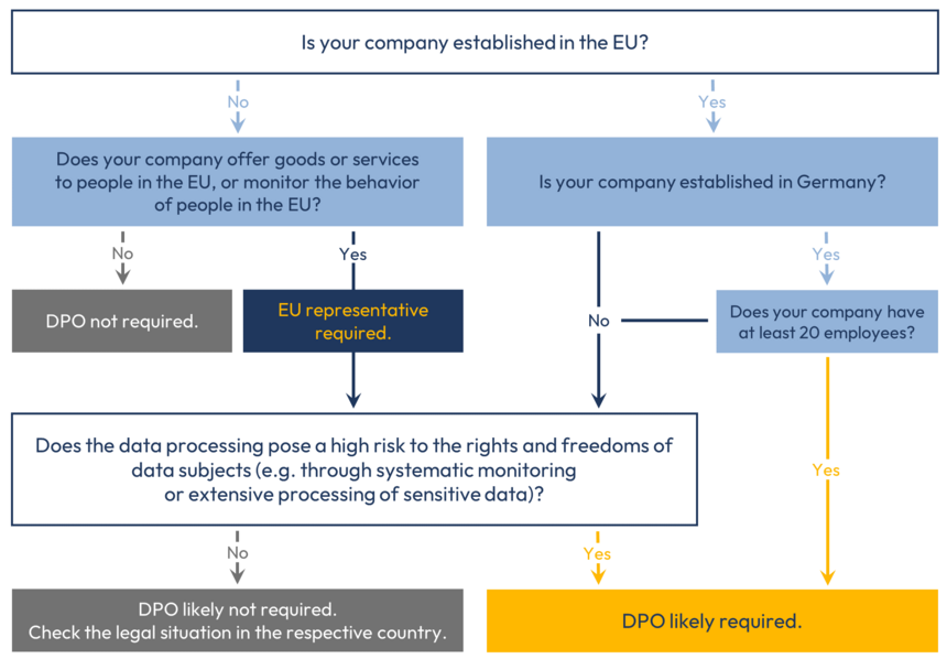 For many companies processing data from the EU or EEA, the designation of a DPO is a legal requirement. The exact regulations vary from country to country within the EU. The flowchart below may serve as initial guidance.