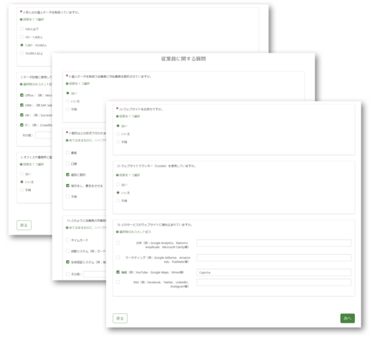 オンライン上でIT、法律およびコンプライアンス体制の整備に関する約200項目の質問にご回答いただきます。
